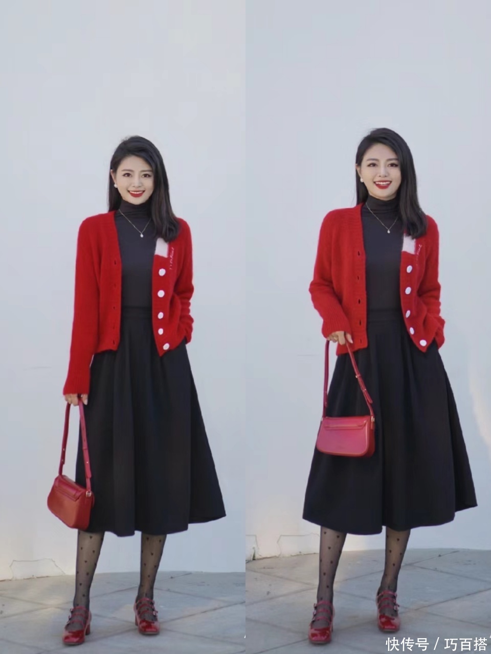 黑丝和半裙是官配CP,淌若你正在为挑选单品而发愁,不错模仿博主身上这种组合风景,不可爱超短裙的姐妹,采选过膝裙+黑丝+紧口及踝靴亦然OK的。