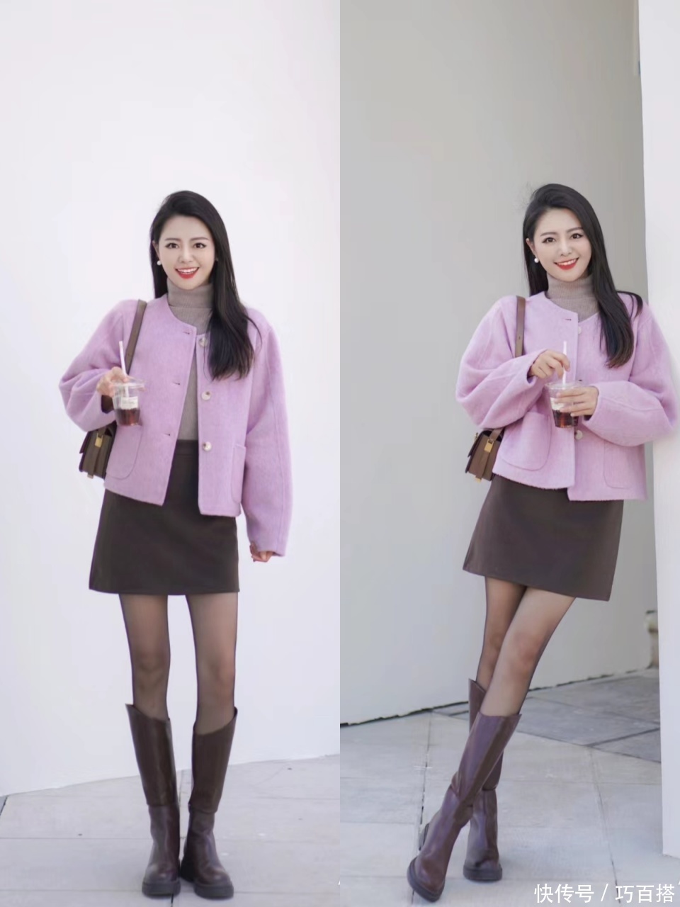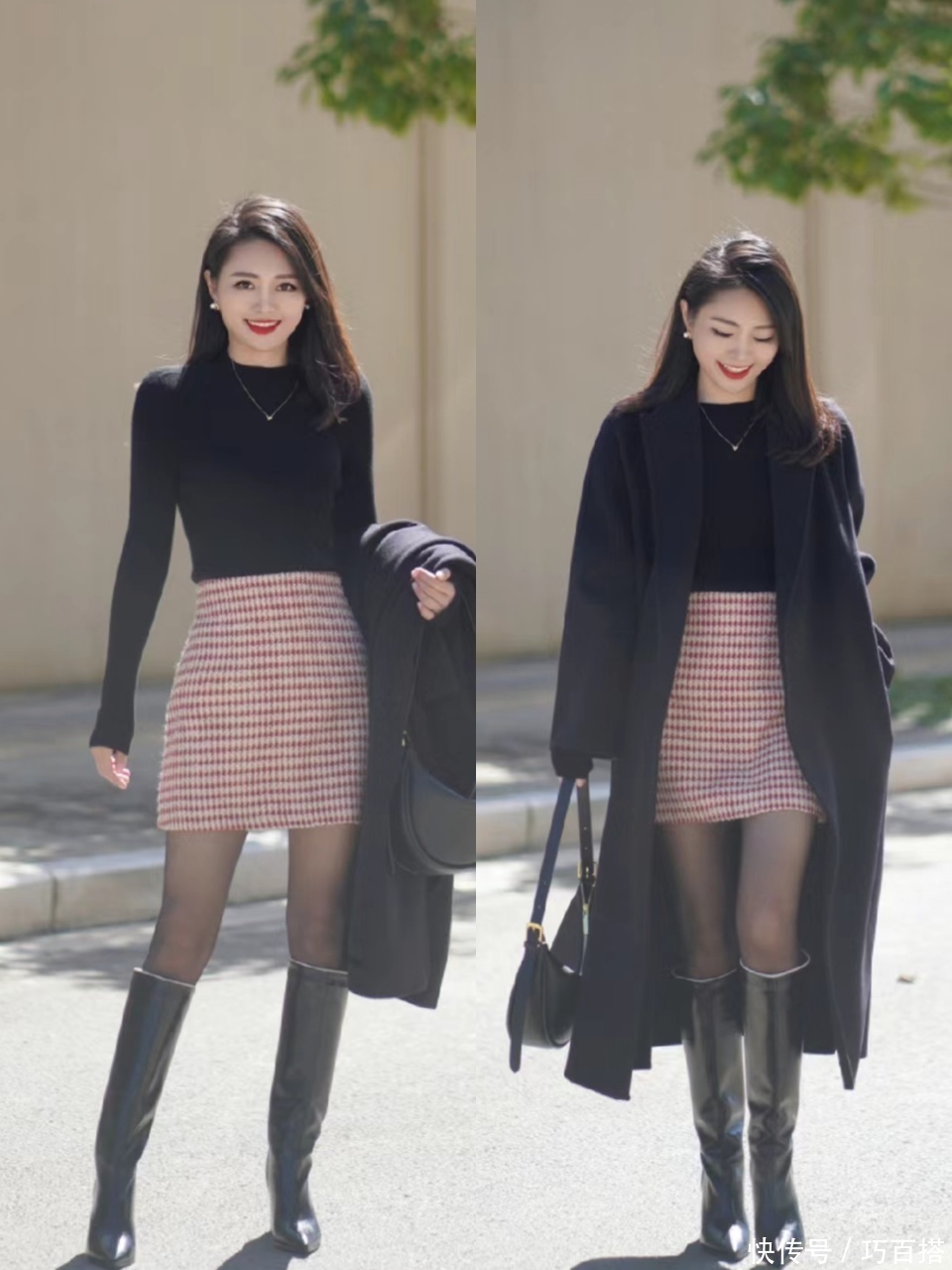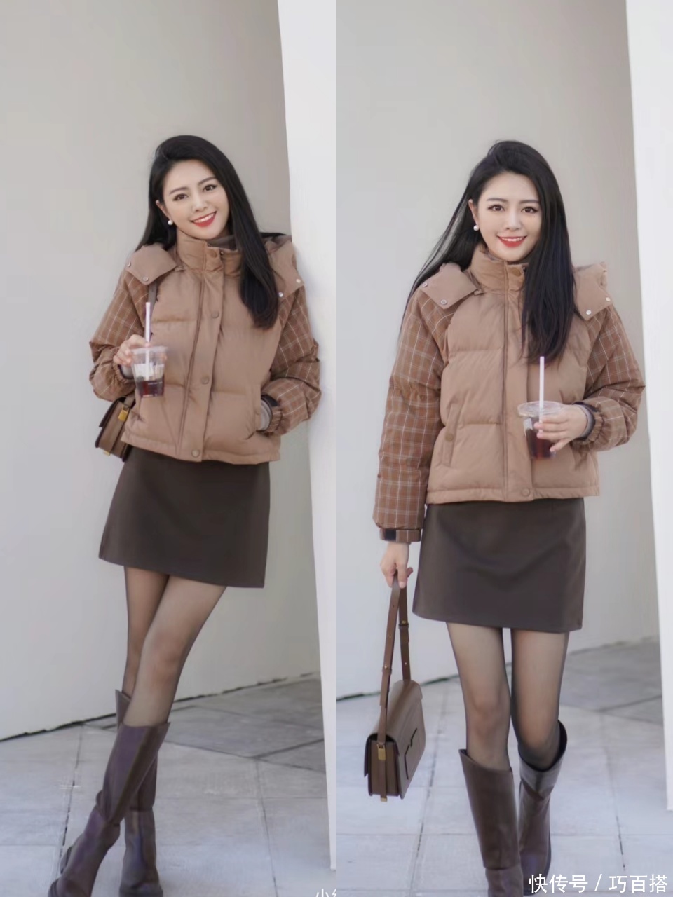 加绒黑丝上身能展示出接地气的造型,基本等同于博主身上这套造型,短款羽绒服搭配短款直筒半裙,在黑丝和高筒靴的帮扶下造成小面积露肉的视觉成果,从容又骄贵,贼有辨识度。